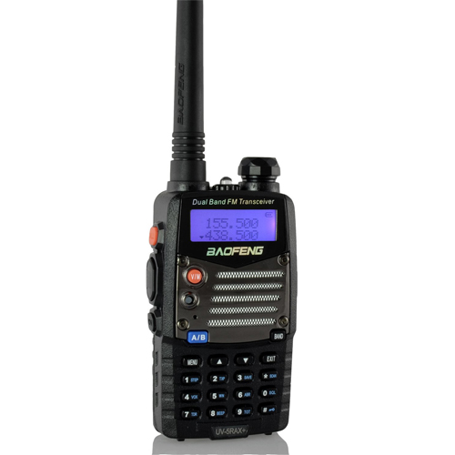 The Baofeng UV-5RAX+ is a hand held transceiver providing 5 watts in the frequency range of 136-174 MHz and 400-480 MHz. It is a compact, economical HT that includes a special VHF receive band from 65 - 108 MHz which includes the regular FM broadcast band. Dual watch and dual reception is supported. You get up to 128 memories. Other features include: selectable wide/narrow, battery save function, VOX, DCS/CTCSS encode, key lock and built in flashlight. Selectable frequency steps include: 2.5, 5, 6.25, 10, 12.5 and 25 kHz. RF power may be selected at 4 or 1 watts.