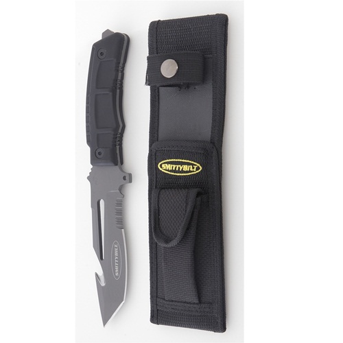 Mango de nylon resistente para mejor agarre, cuchilla con acabado tipo titaneo negro, funda con tiras de velcro para colocarlo en el cinto del pantalon.