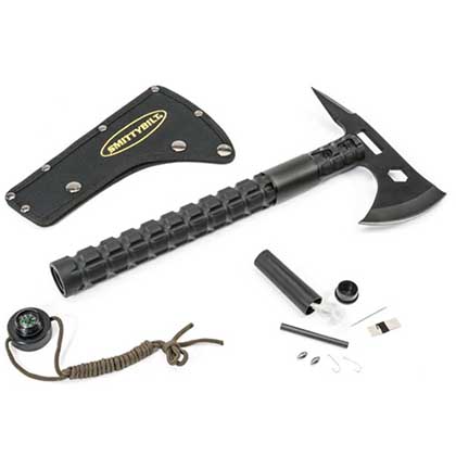 El hacha Smittybilt 4 "x 7.5" está hecho de acero inoxidable y se ha tratado a altas temperaturas para mejorar la eficiencia al cortar. El mango está hecho de material reforzado ergonómico de nylon para que pueda utilizarlo cómodamente. El hacha contiene un kit de supervivencia e incluye lo siguiente: cinta médica, aguja de coser, hilo de pesca, palitos de fósforos y una brújula en el extremo del mango.
